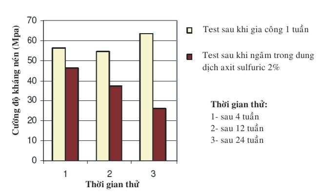 Các mẫu thử được phối trộn dưới dạng những thỏi bêtông, sau khi đóng rắn 1 tuần, đem đo cường độ kháng nén trước và sau khi nhúng vào dung dịch axit H2SO4 2%, theo dõi trong 4 tuần, 12 tuần và 24 tuần. Cường độ kháng nén của các mẫu thử thay đổi do ảnh hưởng của dung dịch axit theo sơ đồ hình 2.