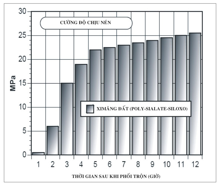Thực nghiệm cho thấy, tùy theo thành phần và tỷ lệ phối trộn, lượng nước thêm vào… thời gian bắt đầu đông kết của vữa thay đổi từ 10 phút đến 45 phút. Kết thúc quá trình đông kết khoảng từ 1 đến 2 giờ sau khi trộn vữa. Cường độ kháng nén của xi măng cũng có thể sớm đạt được ~ 20 Mpa 200 kg/ Cm2 sau 4 tiếng hình 1.